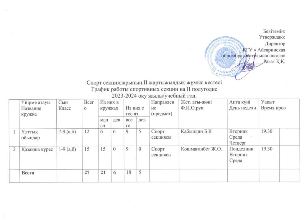 Спорт секцияларының кестесі